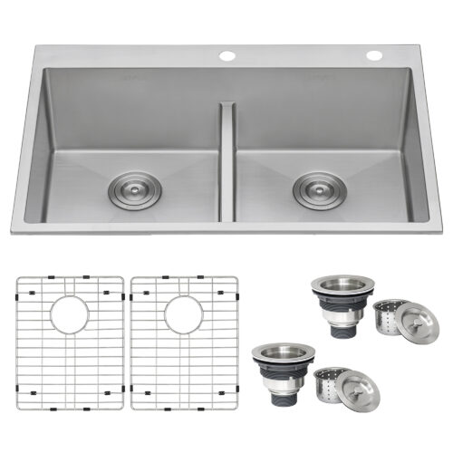 Ruvati 33 x 22 inch Drop-in 50/50 Double Bowl Rounded Corners 16 Gauge Topmount Stainless Steel Kitchen Sink – RVH8051