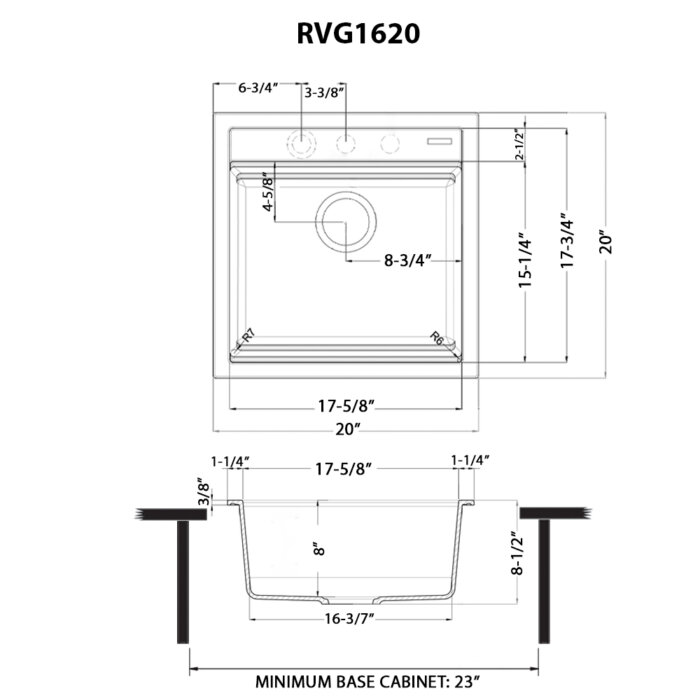 - INTERIOR BOWL DIMENSIONS: 17-5/8″ (wide) x 15-1/4″ (front-to-back) x 8″ (bowl-depth)