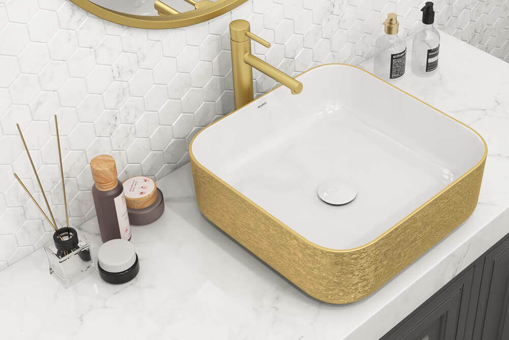 The Pietra collection from Ruvati features decorative ceramic bathroom sinks for a truly elegant and upscale space. Decorated by hand with distinct colors, textures, and patterns, the vessel sinks sit on top of your countertop to showcase the artistic beauty. The Pietra collection is constructed of thick porcelain ceramic for superior strength and long lasting durability. The inside of the bowl is finished with a glossy, smooth enamel that is extremely resistant to scratching, chipping or crazing. Keeping your sink dry and easy to clean, the smooth surface drains water easily and does not stain. For a bathroom or powder room that reflects your unique style, the Pietra is a distinguished choice.
