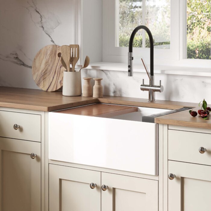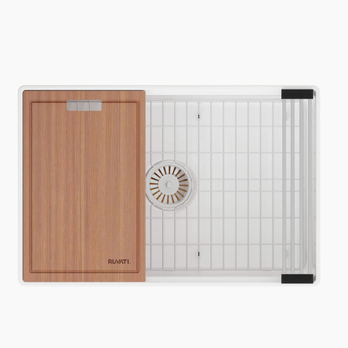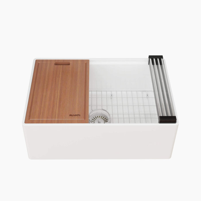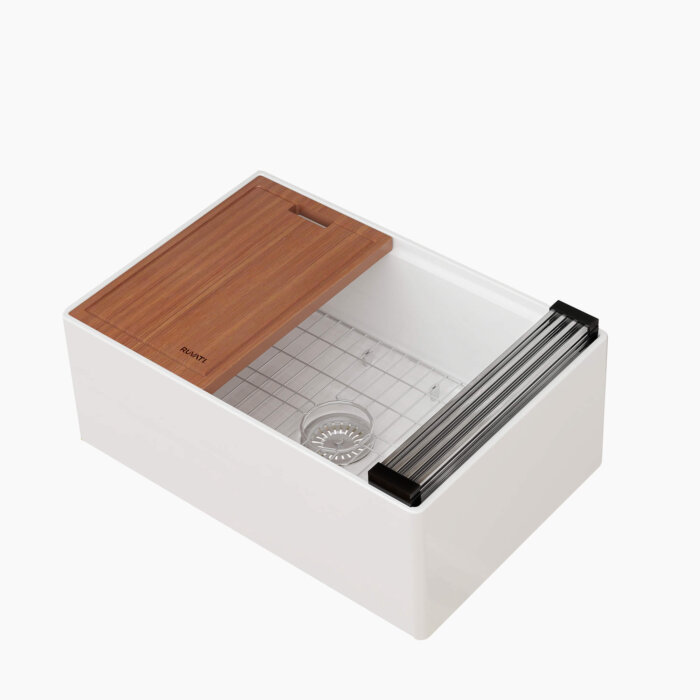 The Fiore collection from Ruvati brings our popular and innovative workstation sink capabilities to farmhouse style fireclay sinks. To ensure precision and durability, the raw white clay is fired at an extremely high temperature of 2900 degrees Fahrenheit as the surface of the sink fuses with the interior. The end result is a powerful finish resistant to chips, cracks, and other abrasions. In addition to the strength and practicality of fireclay, workstation sinks maximize the functionality of your kitchen by adding built-in accessories that slide on integrated tracks in the sink. With Ruvati’s Fiore collection, you’ll receive Ruvati’s patented foldable drying rack, solid wood cutting board, and stainless steel bottom rinse grid. From effortless beauty to everyday function, get the most of your kitchen sink with the Fiore collection from Ruvati.