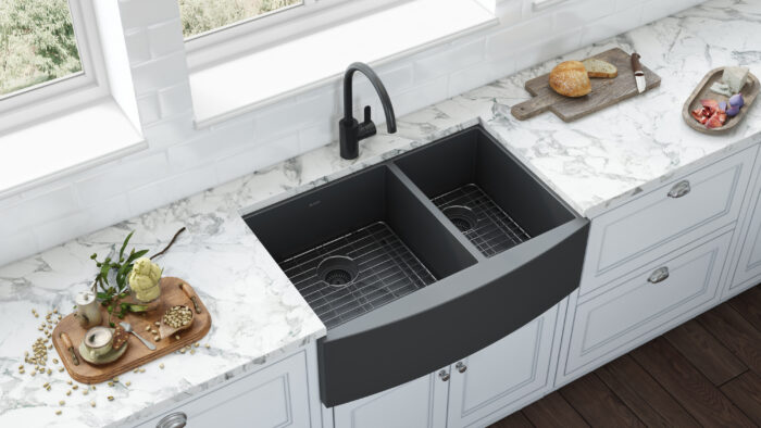 Ruvati 33-inch Gunmetal Black Stainless Steel 60/40 Double Bowl Apron-Front Farmhouse Kitchen Sink – RVH9742BL