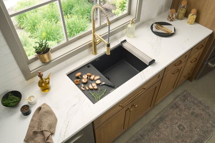 Crafted in Italy, the epiStage collection combines workstation functionality with the beauty of granite composite sinks. The workstation design features a built-in platform for each unique accessory.