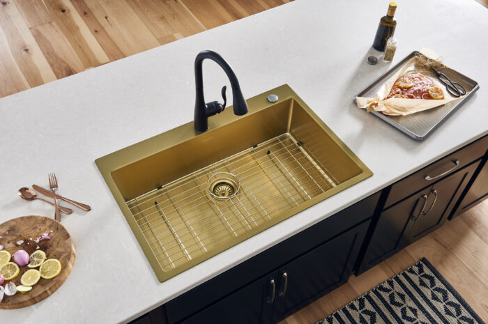 With an innovative nano-PVD finish, the Terraza collection from Ruvati brings color to the world of stainless steel. Offered in gold, copper, and black, the stainless steel is overlaid with a beautiful color finish and matte texture that is resistant to fingerprints, wear, and abrasion. With single and double bowl sinks available in a variety of installation options, each sink in this collection will also feature a bottom rinse grid for added protection. Matching your sink to your kitchen accents and appliances has never been easier than with our Terraza collection.