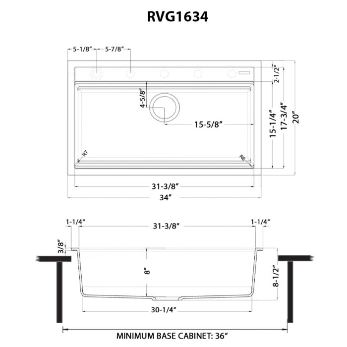 - INTERIOR BOWL DIMENSIONS: 31-3/8″ (wide) x 15-1/4″ (front-to-back) x 8″ (bowl-depth)