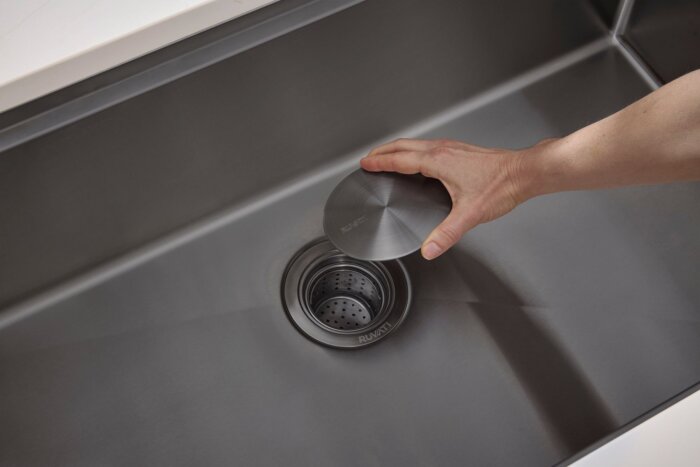 This stainless steel decorative drain cover is designed to hide your kitchen sink drain or your garbage disposal’s black hole. It is not a stopper. It sits loosely on top of your kitchen sink basket strainer drain, or your garbage disposal flange, and allows water and waste to flow through freely. It fits any standard kitchen sink drain or disposal flange. Available in brushed stainless steel, gunmetal black, and brushed gold satin brass, this sink drain cover matches the finish of your stainless steel sink. Now you no longer have to look at the dirty waste trapped in your sink strainer, or the black hole of your garbage disposal flange. Everything stays hidden under the sleek looking practical drain cover from Ruvati.