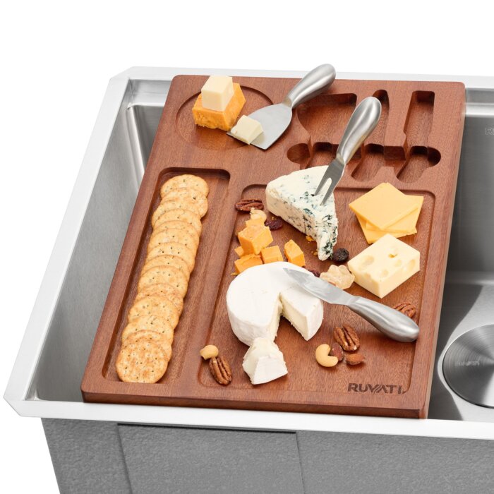 Perfect for gifting, housewarmings, or weddings, the Ruvati Charcuterie Board doubles as a stylish cheese board, charcuterie tray, or light-duty cutting surface. Ideal for everyday food prep or entertaining guests, this versatile accessory comes with a 3-piece Kufie accessory set, adding even more functionality. Food safe and easy to clean, the Charcuterie Board is compatible with all Ruvati LedgeFit® workstation sinks, fitting seamlessly into your kitchen setup.