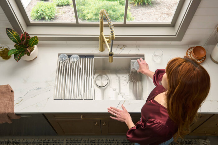 - BRUSHED GOLD finish for modern style. Note: our gold sinks are a different shade of gold and do not match our gold faucet color; we recommend pairing contrasting colors from our wide range.