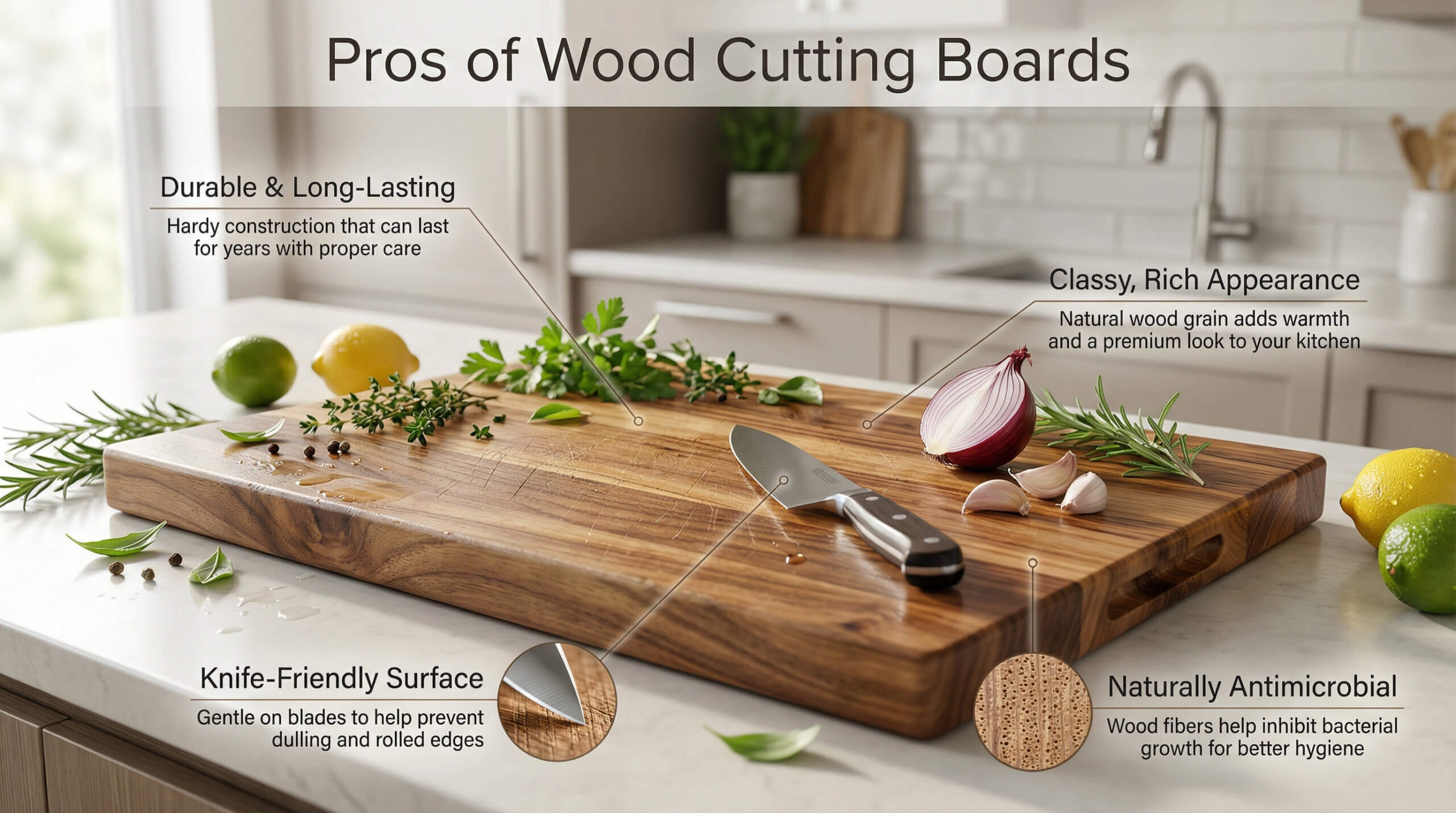 - Another benefit of wood cutting boards is their looks and appearance. Since they are made from genuine wood, they can give off a classy richness in your kitchen.