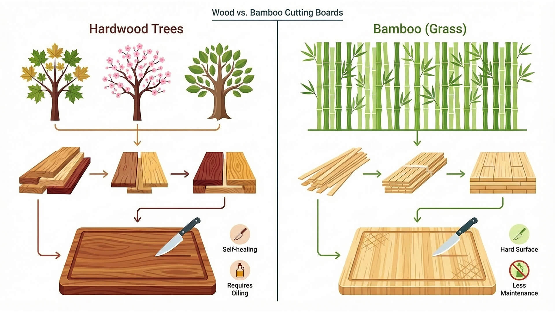 | Material | Hardwoods like maple, cherry, walnut, and beech | Processed bamboo stalks (technically a grass, compressed with adhesives) |
